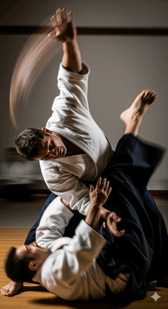 - Kaiten Nage (Proyección en Rueda): Con orígenes en las artes clásicas de lucha como el sumo y el jujutsu, esta técnica utiliza un movimiento circular de “rueda” para proyectar al atacante. Cuando el adversario lanza un golpe, el defensor lo desvía y lo acompaña en su retirada. Luego, el defensor barre el brazo del atacante y lo guía en un movimiento de “rodar” sobre su propia cabeza y cuerpo, proyectándolo. Al igual que el Irimi Nage, el Kaiten Nage puede ser adaptado para inmovilizar al oponente en el suelo en lugar de proyectarlo, demostrando que su objetivo primordial es el control, no la destrucción.15