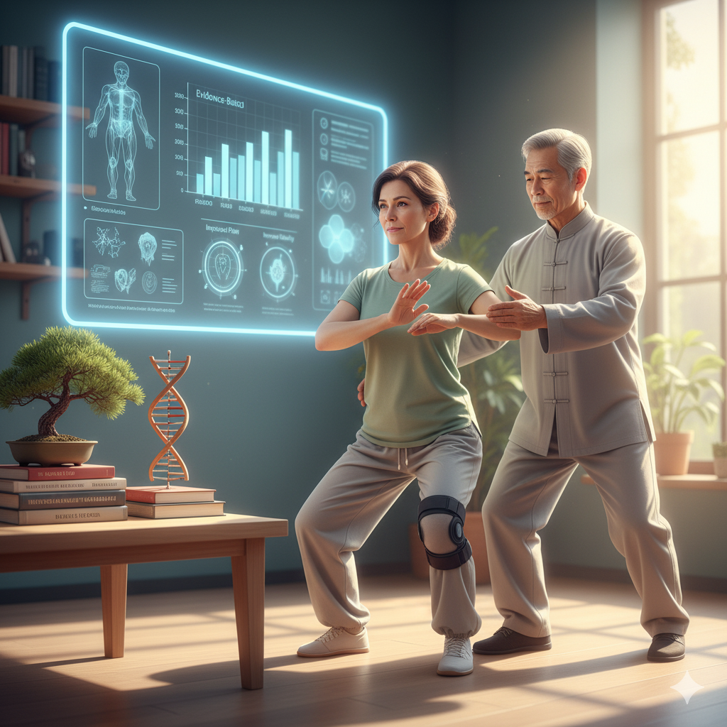 El Taichí se recomienda como una forma de ejercicio segura para personas con artritis [2]. Estilos específicos, como el Taichí de estilo Sun, han sido formalizados en programas terapéuticos (como el Tai Chi for Arthritis) que se centran en aliviar el dolor por osteoartritis de rodilla [12, 13]. La comunidad médica y académica ha reconocido la necesidad de desarrollar y validar protocolos estandarizados de Taichí específicamente adaptados para maximizar la reducción del dolor de rodilla [14]. El movimiento suave y continuo ayuda a mantener la movilidad sin el estrés del impacto [4].