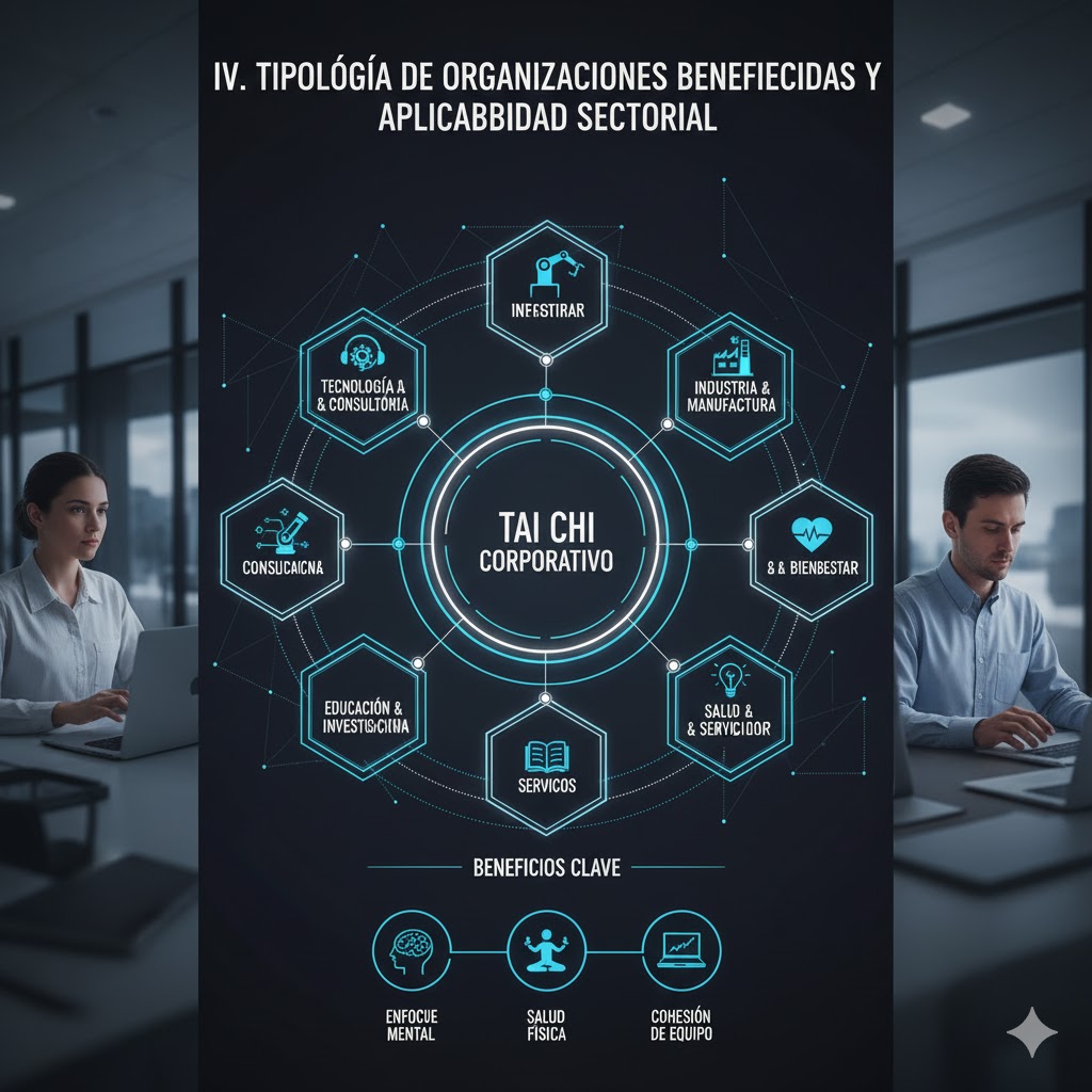 En industrias como las Finanzas, la Tecnología, y la Consultoría, donde la sobrecarga cognitiva y el riesgo de burnout son altos, el TCC ofrece un método estructurado para gestionar la fatiga mental. Estos sectores ya suelen incorporar programas de bienestar mental, como sesiones de mindfulness o meditación.14 El TCC se integra perfectamente como una práctica de movimiento consciente que combate el sedentarismo asociado a las largas jornadas, mientras que la mejora en la oxigenación cerebral incrementa la agudeza, la memoria y el rendimiento sostenido.12
