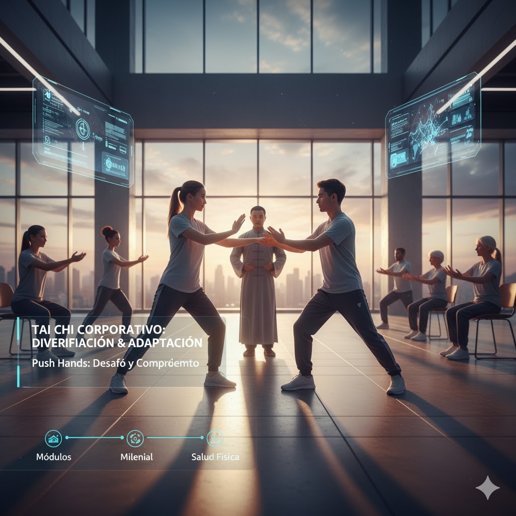 Para evitar que el programa pierda atractivo con el tiempo, es esencial evitar la oferta de un contenido “talla única.” La práctica debe ser adaptada a la demografía de la plantilla. Por ejemplo, para atraer a empleados más jóvenes o a aquellos con una mentalidad orientada al desafío físico, puede ser ventajoso introducir la dimensión marcial del Taiji, como el push hands (Tui Shou), para mantenerlos interesados y comprometidos.10 La diversificación del contenido es fundamental para asegurar la sostenibilidad del programa a largo plazo.